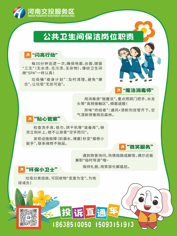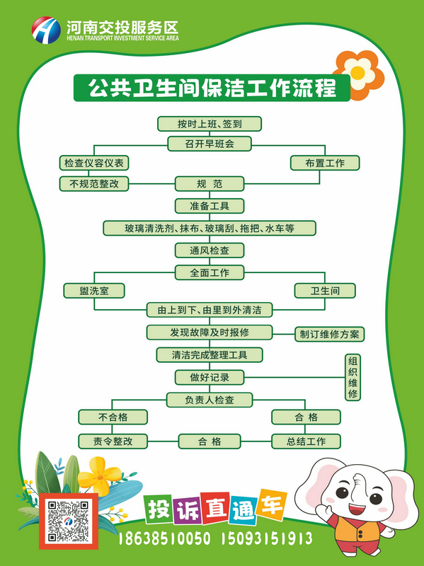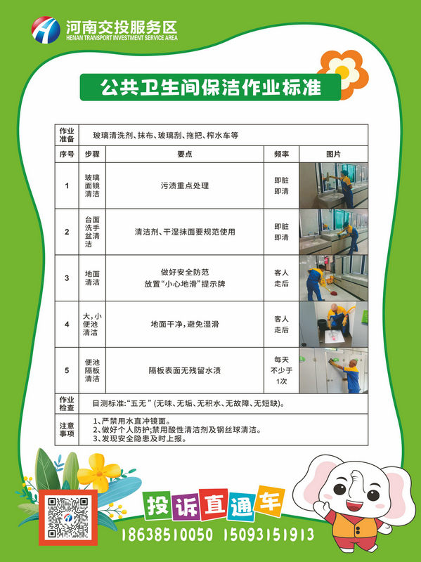此次标识牌设计聚焦卫生间管理核心,围绕“公共卫生间保洁岗位职责”“作业流程”“工作标准”三大模块构建标准化管理闭环,串联管理节点,同时添加投诉电话、服务评价等内容面向司乘,实现服务效率与管理效能双提升。